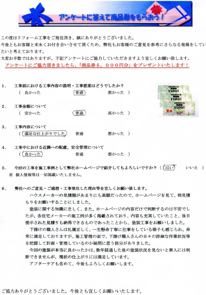 ハウスメーカーの見積額があまりにも高額だったので、ホームページをみて、相見積りをお願いすることにしました。塗装に関する知識に乏しく、またホームページの内容だけで判断するのは不安でしたが、各住宅メーカーの施工例が多く掲載されており、内容も充実していたこと、後日提示された見積りも納得できるものであったことから、塗装工事をお願いしました。下請けの職人さんは礼儀正しく、一生懸命丁寧に仕事をしている様子も感じられ、非常の満足しておりますが、施工管理の面で下請けさんの日々の詳細な作業状況等を把握して計画・管理しているのか疑問に思う部分がありました。今回の塗装が本当に良かったかは数年経過した後の塗装状況を見ないと素人には判断できませんが、現状の仕上がりには満足しています。アフターケアも含めて、今後もよろしくお願いします。