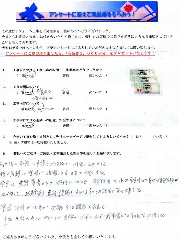 同じぐらいの金額の見積りがありましたが、内容が不安でした。特に屋根の塗装が信頼できることで選びました。今までは建築業者からの説明でしたので、材料や工法について安心できる説明がされなくて、経験ある直接現場に関わる方からの説明で安心できました。塗装以外の工事が必要になった場合の対応で今回玄関のネームプレートの交換が必要で別業者を探すのに苦労しました。