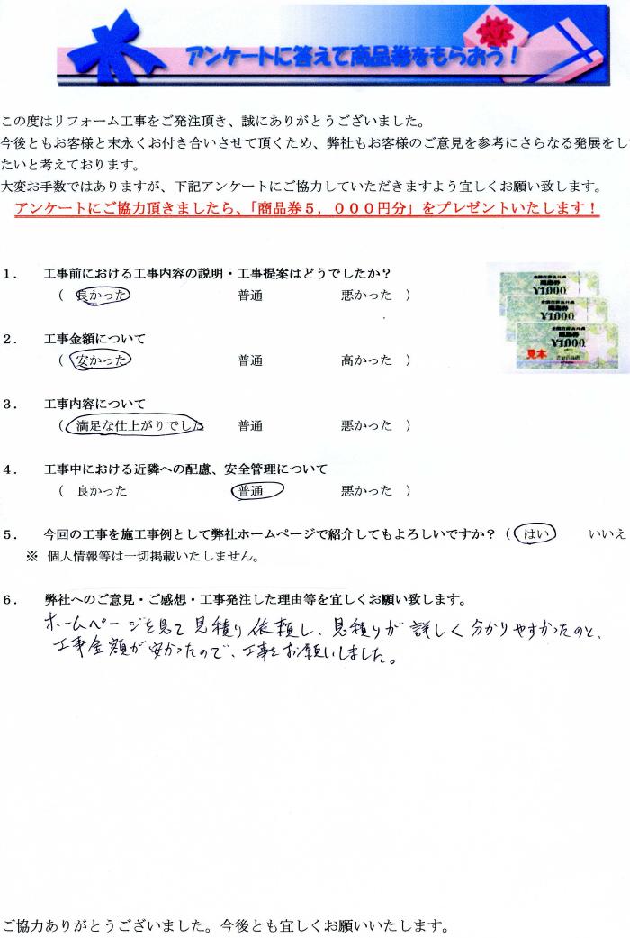 瀬戸市で外壁塗装リフォームをされたお客様の声 1.工事前における工事内容の説明・工事提案はどうでしたか? 良かった 2.工事金額について 安かった 3.工事内容について 満足な仕上がりでした 4.工事中にあける近隣への配慮、安全管理について 普通 5.弊社へのご感想・工事発注した理由等を宜しくお願い致します。 ホームページを見て見積もり依頼し、見積りが詳しく分かりやすかったのと、工事金額が安かったので工事をお願いしました。 ホームページを見て見積もり依頼し、見積りが詳しく分かりやすかったのと、工事金額が安かったので工事をお願いしました。 前の記事 次の記事 一覧へ戻る