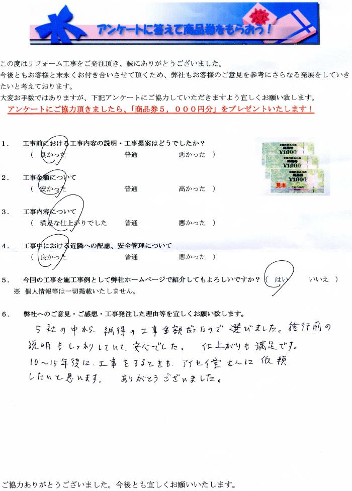 あま市で外壁塗装リフォームをされたお客様の声 1.工事前における工事内容の説明・工事提案はどうでしたか? 良かった 2.工事金額について 安かった 3.工事内容について 満足な仕上がりでした 4.工事中にあける近隣への配慮、安全管理について 良かった 5.弊社へのご感想・工事発注した理由等を宜しくお願い致します。 5社の中から納得の工事金額だったので選びました。施工前の説明もしっかりしていて安心でした。仕上がりも満足です。10~15年後に工事をする時もアイセイ堂さんに依頼をしたいと思います。ありがとうございました。 5社の中から納得の工事金額だったので選びました。施工前の説明もしっかりしていて安心でした。仕上がりも満足です。10~15年後に工事をする時もアイセイ堂さんに依頼をしたいと思います。ありがとうございました。 前の記事 次の記事 一覧へ戻る