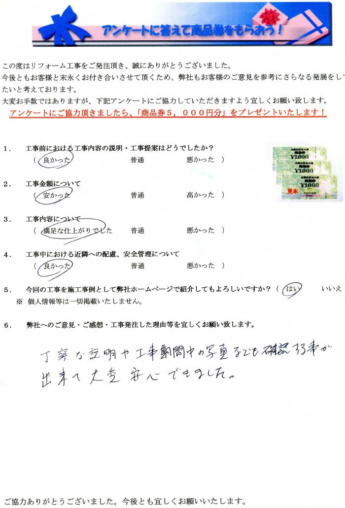 名古屋市中村区で外壁塗装リフォームをされたお客様の声 1.工事前における工事内容の説明・工事提案はどうでしたか? 良かった 2.工事金額について 安かった 3.工事内容について 満足な仕上がりでした 4.工事中にあける近隣への配慮、安全管理について 良かった 5.弊社へのご感想・工事発注した理由等を宜しくお願い致します。 丁寧な説明や工事期間中の写真なども確認する事が出来て大変安心できました。 丁寧な説明や工事期間中の写真なども確認する事が出来て大変安心できました。 前の記事 次の記事 一覧へ戻る