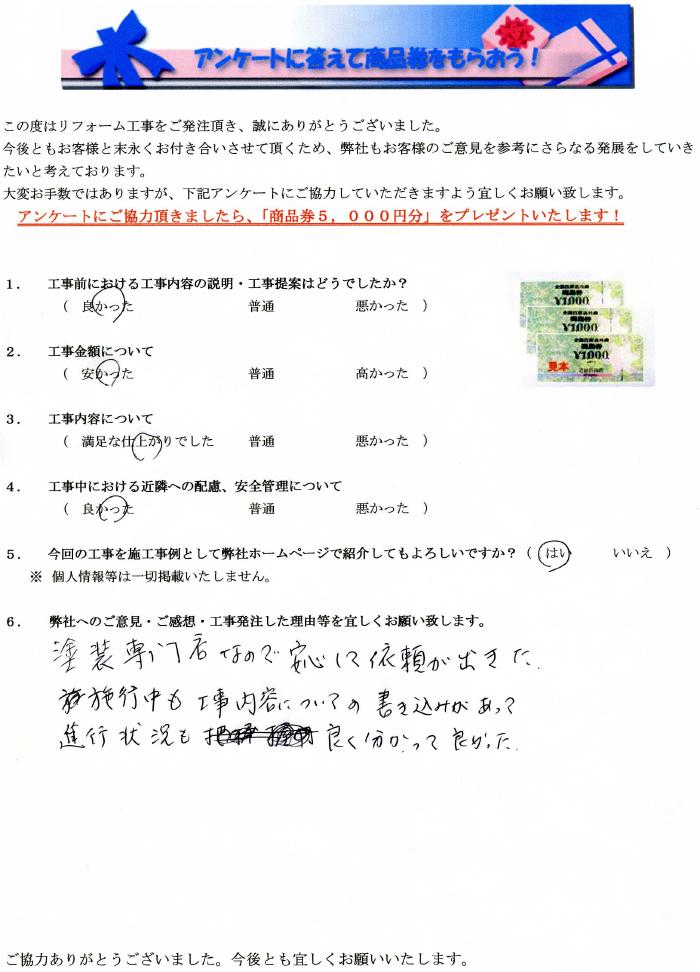 名古屋市緑区で外壁塗装リフォームをされたお客様の声 1.工事前における工事内容の説明・工事提案はどうでしたか? 良かった 2.工事金額について 安かった 3.工事内容について 満足な仕上がりでした 4.工事中にあける近隣への配慮、安全管理について 良かった 5.弊社へのご感想・工事発注した理由等を宜しくお願い致します。 塗装専門店なので安心して依頼ができた。施工中も工事内容についての書き込みがあって進行状況も良くわかってよかった。 塗装専門店なので安心して依頼ができた。施工中も工事内容についての書き込みがあって進行状況も良くわかってよかった。 前の記事 次の記事 一覧へ戻る