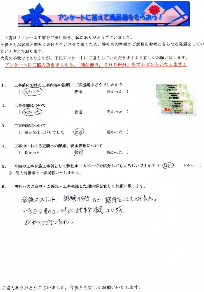 岐阜県瑞穂市で外壁塗装リフォームをされたお客様の声 1.工事前における工事内容の説明・工事提案はどうでしたか? 良かった 2.工事金額について 安かった 3.工事内容について 普通 4.工事中にあける近隣への配慮、安全管理について 普通 5.弊社へのご感想・工事発注した理由等を宜しくお願い致します。 金額のメリット、経験の多さなど期待をして頼みました。一言では書けないですがまずまず満足しています。ありがとうございました。 金額のメリット、経験の多さなど期待をして頼みました。一言では書けないですがまずまず満足しています。ありがとうございました。 前の記事 次の記事 一覧へ戻る