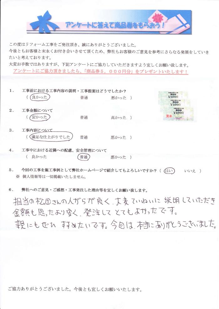 西尾市で外壁塗装リフォームをされたお客様の声 1.工事前における工事内容の説明・工事提案はどうでしたか? 良かった 2.工事金額について 安かった 3.工事内容について 満足な仕上がりでした 4.工事中にあける近隣への配慮、安全管理について 普通 5.弊社へのご感想・工事発注した理由等を宜しくお願い致します。 担当の営業マンの人柄が良く、大変丁寧に説明して頂き、金額も思ったより安く発注してとても良かったです。親にもぜひ勧めたいです。今回は本当にありがとうございました。 担当の営業マンの人柄が良く、大変丁寧に説明して頂き、金額も思ったより安く発注してとても良かったです。親にもぜひ勧めたいです。今回は本当にありがとうございました。 前の記事 次の記事 一覧へ戻る