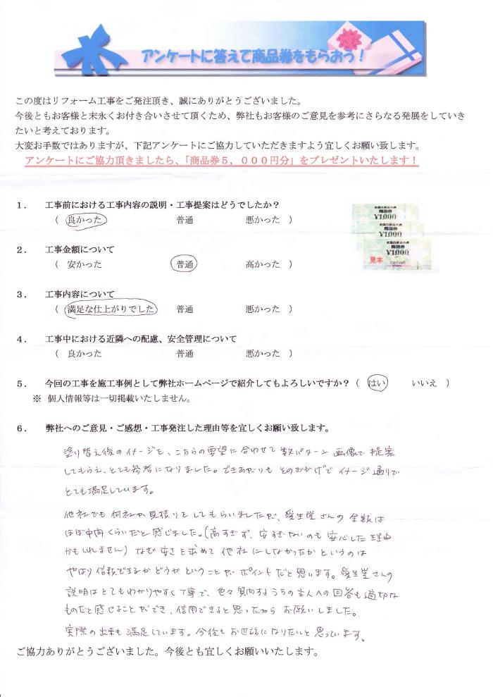 塗り替え後のイメージをこちらの要望に合わせて数パターン画像で提供してもらえ、とても参考になりました。できあがりもそのおかげでイメージ通りでとても満足しています。他社でも何社か見積りをしてもらいましたが、愛生堂さんの金額はほぼ中間くらいだと感じました。(高すぎず、安すぎないのも安心した理由かもしれません)なぜ安さを求めて他社にしなかったかというのはやはり信頼できるかどうかということがポイントだと思います。愛生堂さんの説明はとてもわかりやすく丁寧で、色々質問するうちの主人の回答も適切なものだと感じることができ、信用できると思ったからお願いしました。実際の出来も満足しています。今後もお世話になりたいと思っています。
