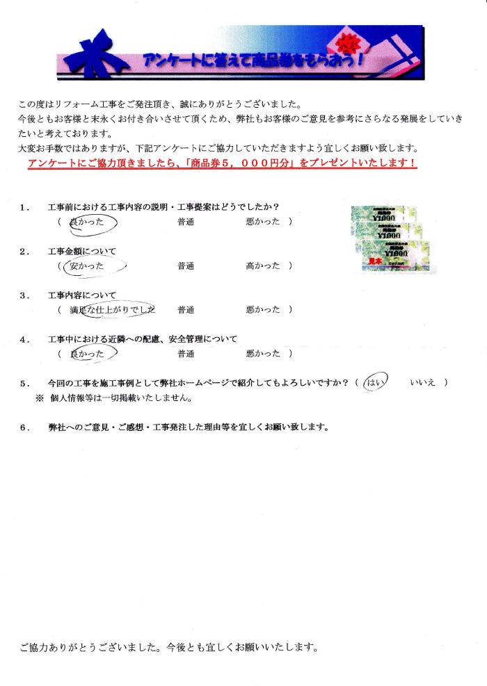 春日井市で外壁塗装リフォームをされたお客様の声 1.工事前における工事内容の説明・工事提案はどうでしたか? 良かった 2.工事金額について 安かった 3.工事内容について 満足な仕上がりでした 4.工事中にあける近隣への配慮、安全管理について 良かった 春日井市でダイワハウスの外壁塗装と屋根塗装、シーリング工事を実施いたしました。 前の記事 次の記事 一覧へ戻る