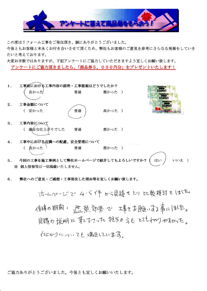 岩倉市で外壁塗装リフォームをされたお客様の声 1.工事前における工事内容の説明・工事提案はどうでしたか? 良かった 2.工事金額について 普通 3.工事内容について 満足な仕上がりでした 4.工事中にあける近隣への配慮、安全管理について 良かった 5.弊社へのご感想・工事発注した理由等を宜しくお願い致します。 ホームページで4、5件から見積をとり比較検討をしました。保証の期間、遮熱効果で工事をお願いする事にしました。見積の説明に来て下さった担当の方もとてもわかりやすかった。仕上がりについても満足しています。 ホームページで4、5件から見積をとり比較検討をしました。保証の期間、遮熱効果で工事をお願いする事にしました。見積の説明に来て下さった担当の方もとてもわかりやすかった。仕上がりについても満足しています。 前の記事 次の記事 一覧へ戻る