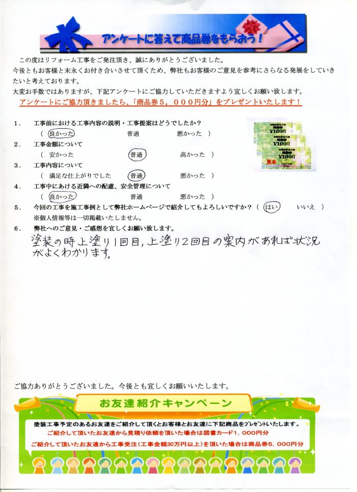 名古屋市緑区で外壁塗装リフォームをされたお客様の声 1.工事前における工事内容の説明・工事提案はどうでしたか? 良かった 2.工事金額について 普通 3.工事内容について 普通 4.工事中にあける近隣への配慮、安全管理について 良かった 5.弊社へのご感想・工事発注した理由等を宜しくお願い致します。 塗装の時上塗り1回目、上塗り2回目の案内があれば状況がよくわかります。 塗装の時上塗り1回目、上塗り2回目の案内があれば状況がよくわかります。 前の記事 次の記事 一覧へ戻る