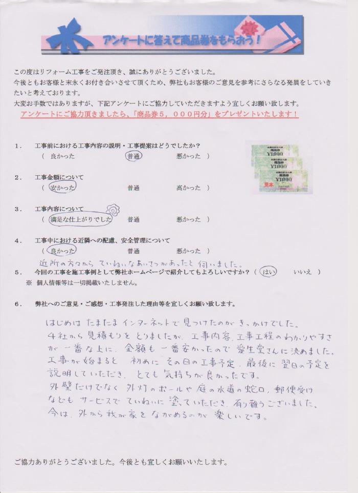 はじめはたまたまインターネットで見つけたのがきっかけでした。4社から見積もりをとりましたが、工事内容・工事工程の分かりやすさが一番な上に金額も一番安かったので愛生堂さんに決めました。工事が始まると初めにその日の工事予定、最後に翌日の予定を説明して頂き、とても気持ちが良かったです。外壁だけでなく、外灯のポールや庭の水道の蛇口、郵便受けなどもサービスで丁寧に塗っていただき、有り難うございました。今は外から我が家をながめるのが楽しいです。