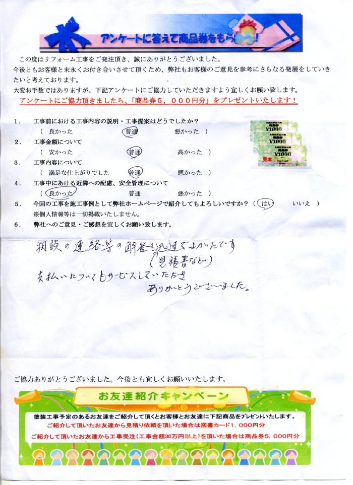 名古屋市昭和区で外壁塗装リフォームをされたお客様の声 1.工事前における工事内容の説明・工事提案はどうでしたか? 普通 2.工事金額について 普通 3.工事内容について 普通 4.工事中にあける近隣への配慮、安全管理について 普通 5.弊社へのご感想・工事発注した理由等を宜しくお願い致します。 相談の連絡等の回答も見積書も迅速でよかったです。支払いについてもサービスして頂きありがとうございました。 相談の連絡等の回答も見積書も迅速でよかったです。支払いについてもサービスして頂きありがとうございました。 前の記事 次の記事 一覧へ戻る