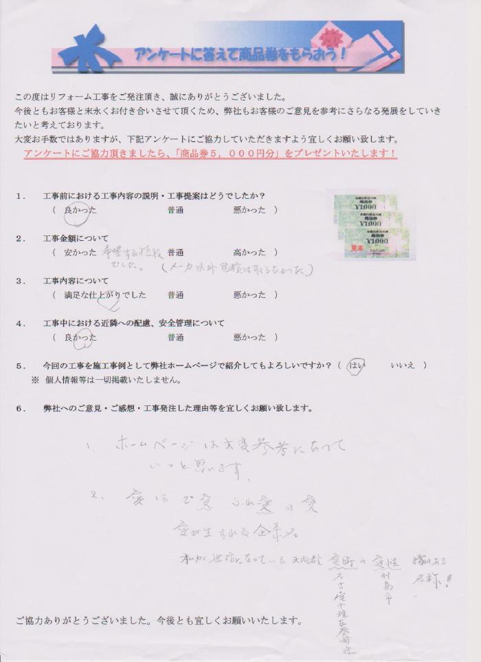岐阜県笠松町で外壁塗装リフォームをされたお客様の声 1.工事前における工事内容の説明・工事提案はどうでしたか? 良かった 2.工事金額について 安かった 3.工事内容について 満足な仕上がりでした 4.工事中にあける近隣への配慮、安全管理について 良かった 5.弊社へのご感想・工事発注した理由等を宜しくお願い致します。 ホームページは大変参考になっていいと思います。 ホームページは大変参考になっていいと思います。 前の記事 次の記事 一覧へ戻る