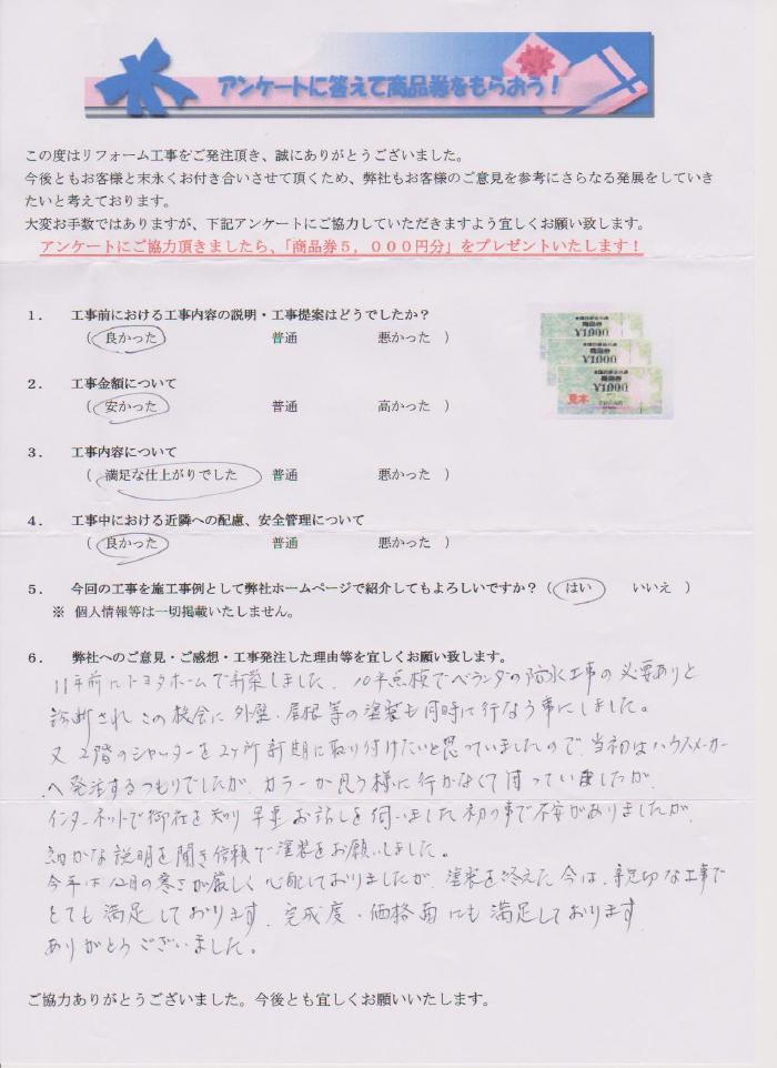 11年前にトヨタホームで新築しました。10年点検でベランダの防水工事の必要ありと診断され、この機会に外壁・屋根等の塗装も同時に行う事にしました。また、2階のシャッターを2ヶ所新規に取り付けたいと思っていましたので当初はハウスメーカーへ発注するつもりでしたが、カラーが思うようにいかなくて困っていましたがインターネットで御社を知り早速お話をお伺いしました。初のことで不安がありましたが、細かな説明を聞き信頼で塗装をお願いしました。今年は12月の寒さが厳しく心配しておりましたが塗装を終えた今は親切な工事でとても満足しております。完成度・価格面にも満足しております。ありがとうございました。