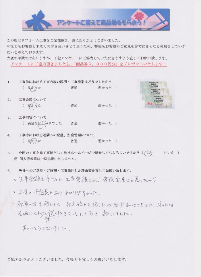 工事金額も手ごろで工事実績もあり信頼できると思ったから。工事の予定表もありわかりやすかった。社員の方も感じよく、仕事始めと終わりには必ずあいさつをされ、終わりにはその日にされた事の説明をきちんとして頂き感心しました。ありがとうございました。