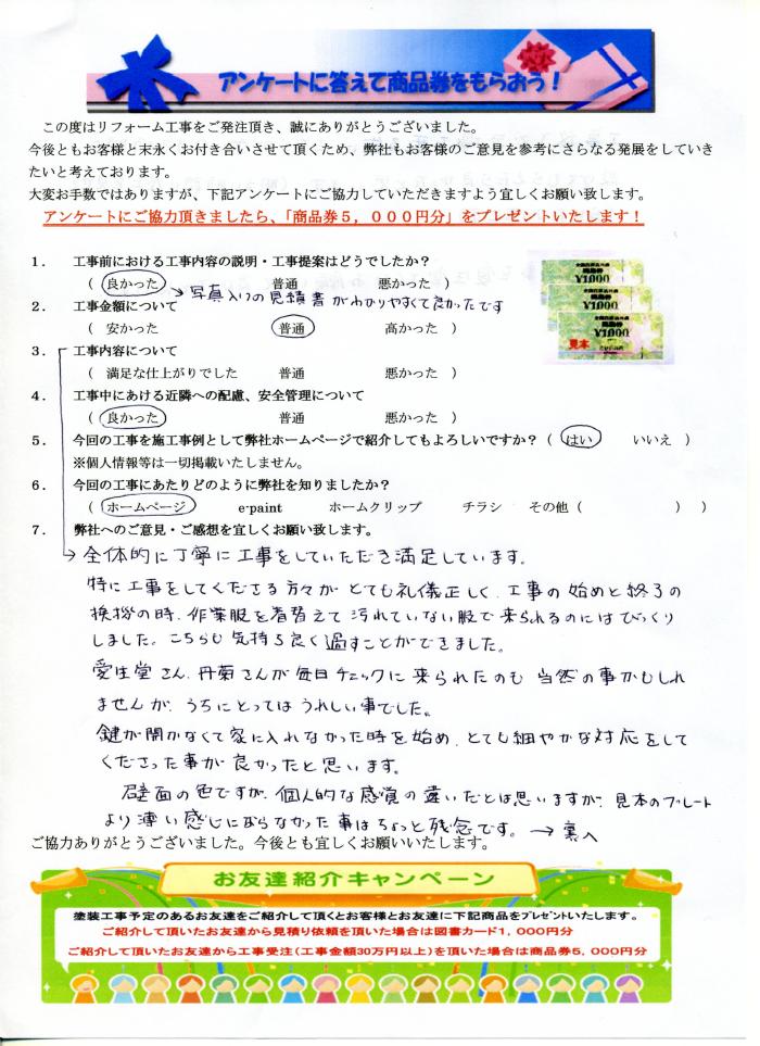 全体的に丁寧に工事をしていただき満足しています。特に工事をしてくださる方々がとても礼儀正しく、工事の始めと終了の挨拶の時作業服を着替えて汚れていない服で来られるのにはびっくりしました。こちらも気持ちよく過ごすことができました。愛生堂さんが毎日チェックに来られたのも当然の事かも知れませんがうちにとっては嬉しいことでした。壁面の色ですが個人的な感覚の違いだとは思いますが見本のプレートより薄い感じにならなかった事はちょっと残念です。工事終了で足場を取る前にこちらがチェックする時間を設けてもらえたら良かったと思います。今回の工事を愛生堂さんにお願いして良かったと思います。