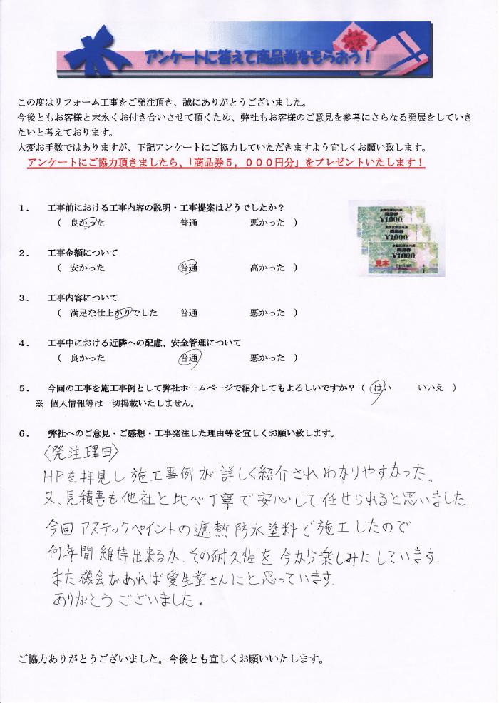 HPを拝見し施工事例が詳しく紹介されわかりやすかった。又、見積書も他社と比べて丁寧で安心して任せられると思いました。今回アステックペイントの遮熱防水塗料で施工したので何年間維持出来るか、その耐久性を今から楽しみにしています。また機会があれば愛生堂さんに思っています。ありがとうございました。