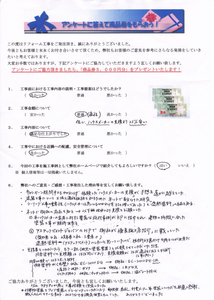 各ハウスメーカーの家屋に対する豊富な施工事例がHPに紹介され、建物の特徴に合った塗装工事が期待できる。アステックペイントジャパンのHPで御社が「優良施工店紹介」に載っていた。遮熱塗料(アステックペイント)にしたいと思っていたので技術的裏付けを得ることができた。見積書を頂いたらもう1社(地元の塗装業者)と比較させて頂いた結果同条件塗料での見積額はほぼ同じであり、見積金額がほぼ適正であると判断。クオリティが高く工事依頼を決定しました。付帯物塗装をフッ素塗装にグレードアップして頂いたり、郵便受・表札・計量メーター等塗装して頂き配慮に感謝。職人さんのマナーも良好、仕上がりも十分満足できるものでした。ありがとうございました。