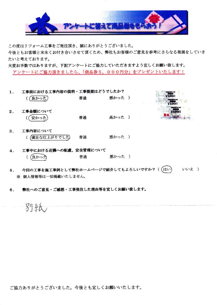 名古屋市天白区で外壁塗装リフォームをされたお客様の声 1.工事前における工事内容の説明・工事提案はどうでしたか? 良かった 2.工事金額について 安かった 3.工事内容について 満足な仕上がりでした 4.工事中にあける近隣への配慮、安全管理について 良かった 名古屋市天白区で外壁塗装リフォームをされたお客様です。 前の記事 次の記事 一覧へ戻る