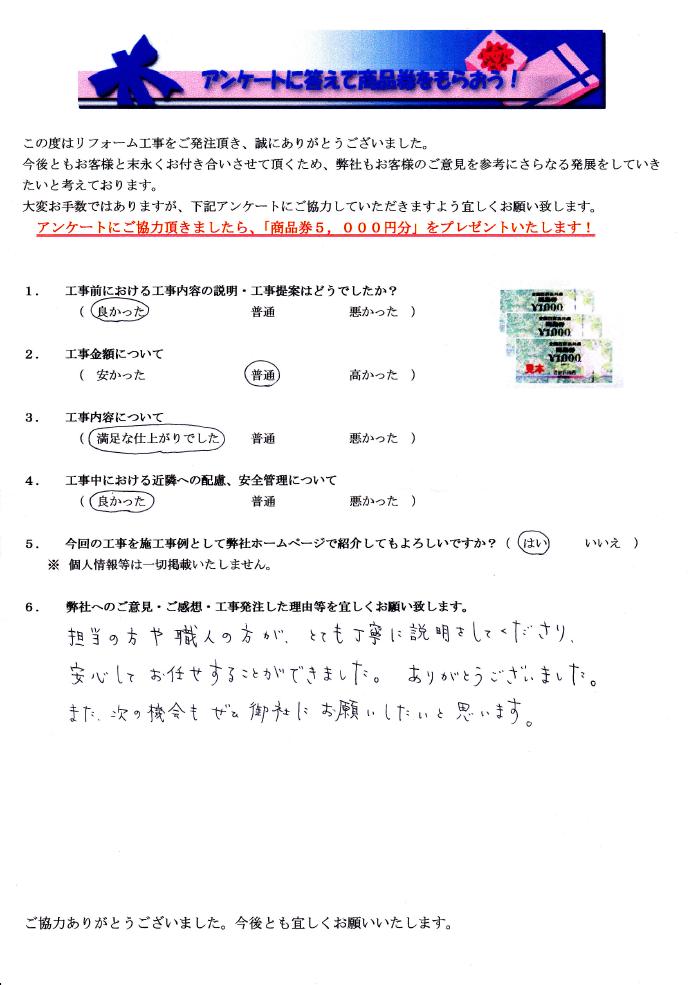 担当の方や職人の方が、とても丁寧に説明をしてくださり、安心してお任せすることができました。ありがとうございました。また、次の機会もぜひ御社にお願いしたいと思います。