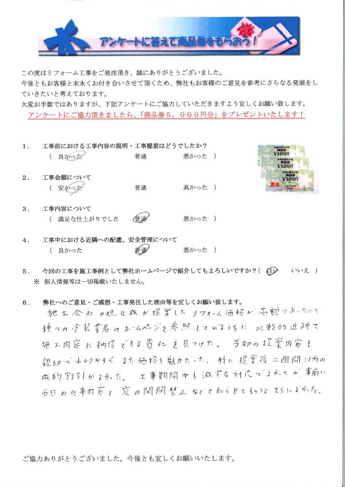 施工会社の旭化成が提案したリフォーム価格が高額であったので種々の塗装業者のホームページを参照しているうちに比較的近所で施工内容に納得できる貴社を見つけた。当初の提案内容も親切で分かり易く、また価格も魅力だった。特に提案後2週間以内の成約割引はよかった。工事期間中も誠実な対応で良かったが、事前に当日の仕事内容と窓の開閉禁止などを知らせてもらうとさらによかった。