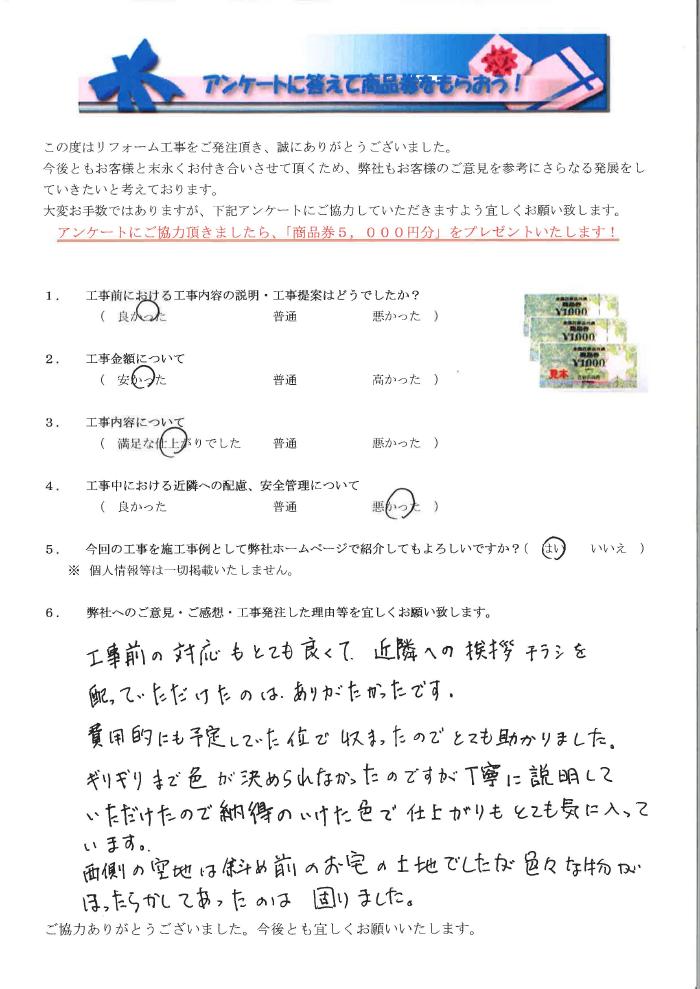 工事前の対応も、とても良くて、近隣への挨拶チラシを配って頂けたのはありがたかったです。費用的にも予定していた位で収まったのでとても助かりました。ギリギリまで色が決められなかったのですが、丁寧に説明して頂けたので納得のいけた色で、仕上がりもとても気に入っています。西側の空地は斜め前のお宅の土地でしたが色々な物がほったらかしてあったのは固まりました。
