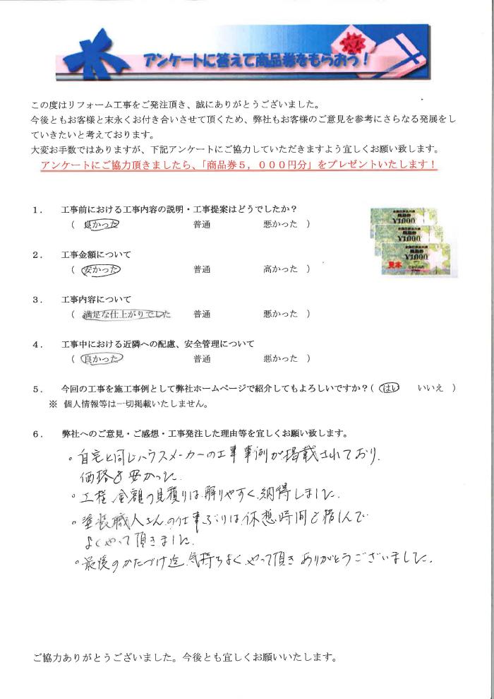 自宅と同じハウスメーカーの工事事例が掲載されており価格も安かった。工程、金額の見積りは解りやすく納得しました。塗装職人さんの仕事ぶりは休憩時間も惜しんでよくやって頂きました。最後のかたづけ迄気持ちよくやって頂きありがとうございました。