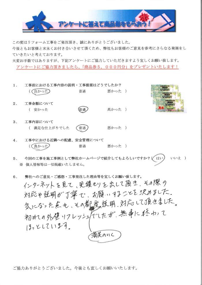インターネットを見て見積もりをだして頂き、その際の対応や説明が丁寧でお願いする事を決めました。急になった点も、その都度満足のいく説明、対応して頂きました。初めての外壁リフレッシュでしたが、無事に終わってほっとしています。