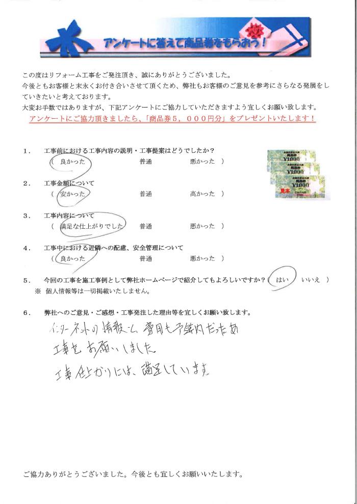 瀬戸市で外壁塗装リフォームをされたお客様の声 1.工事前における工事内容の説明・工事提案はどうでしたか? 良かった 2.工事金額について 安かった 3.工事内容について 満足な仕上がりでした 4.工事中にあける近隣への配慮、安全管理について 良かった 5.弊社へのご感想・工事発注した理由等を宜しくお願い致します。 インターネットの情報と費用も予算内だった為、工事をお願いしました。工事仕上がりには満足しています。 インターネットの情報と費用も予算内だった為、工事をお願いしました。工事仕上がりには満足しています。 前の記事 次の記事 一覧へ戻る