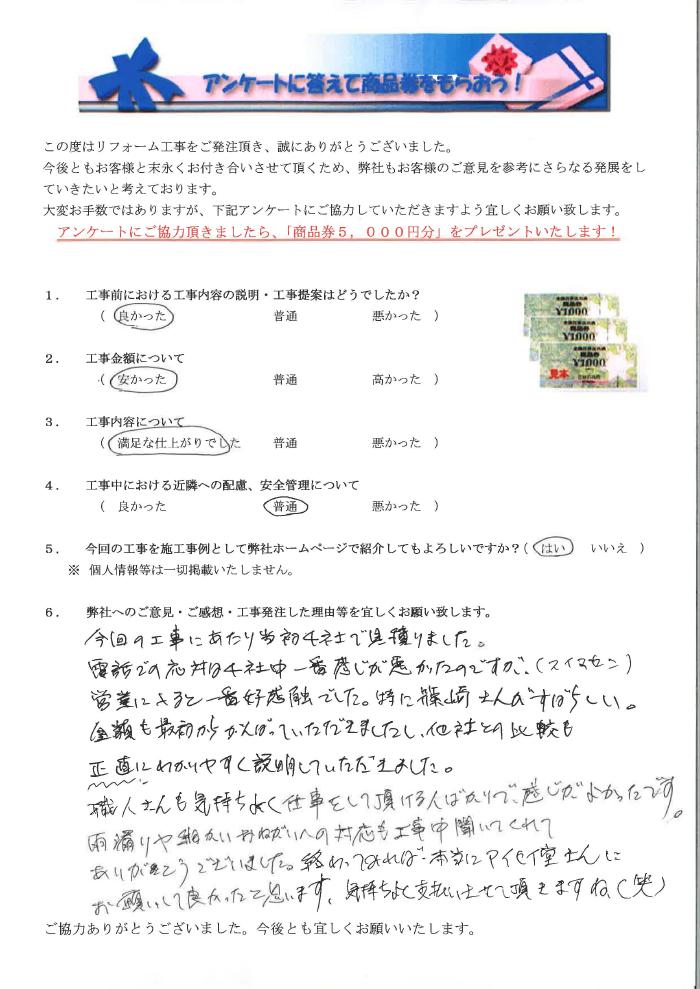 今回の工事にあたり当初4社で見積りました。電話での対応は4社中一番感じが悪かったのですが営業に入ると一番好感触でした。特に営業さんがすばらしい。金額も最初からがんばって頂きましたし、他社との比較も正直にわかりやすく説明していただきました。職人さんも気持ちよく仕事をして頂ける人ばかりで感じが良かったです。雨漏りや細かいお願いへの対応も工事中聞いてくれてありがとうございました。終わったみれば、本当にアイセイ堂さんにお願いしてよかったです。