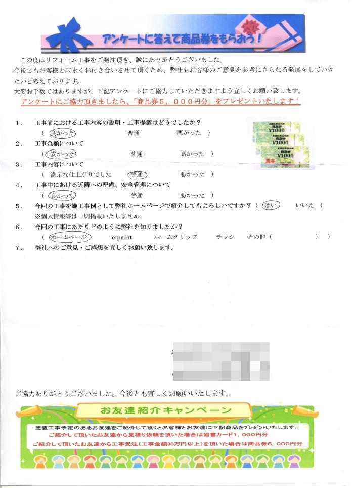 名古屋市天白区で外壁塗装リフォームをされたお客様の声 1.工事前における工事内容の説明・工事提案はどうでしたか? 良かった 2.工事金額について 安かった 3.工事内容について 普通 4.工事中にあける近隣への配慮、安全管理について 良かった 5.弊社へのご感想・工事発注した理由等を宜しくお願い致します。 しっかりと補修した上で外壁塗装をしてもらいました。 前の記事 次の記事 一覧へ戻る