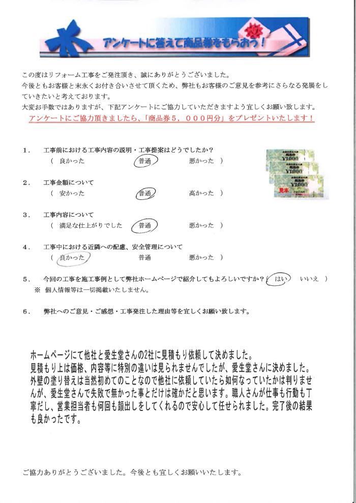 ホームページにて他社と愛生堂さんの2社に見積り依頼して決めました。見積り上は価格、内容等に特別な違いは見られませんでしたが愛生堂さんに決めました。外壁の塗り替えは当然初めてのことなので他社に依頼していたら如何になっていたかは判りませんが、愛生堂さんで失敗は無かった事だけは確かだと思います。職人さんが仕事も行動も丁寧だし、営業担当者も何回も顔出してくれるので安心して任せられました。完了後の結果も良かったです。