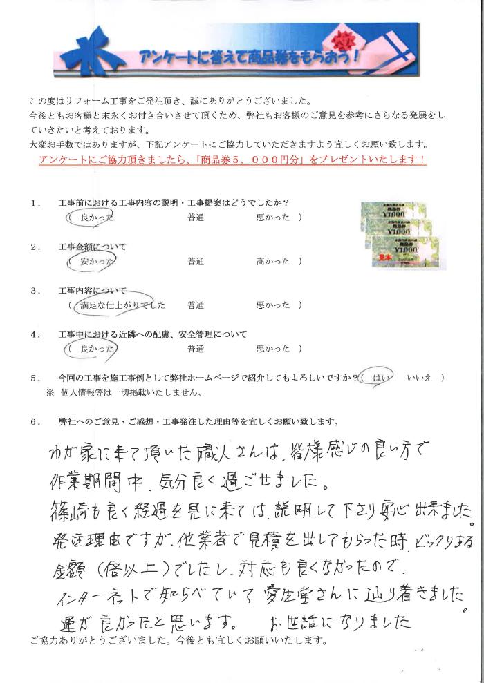 我が家に来て頂いた職人さんは皆さま感じの良い方で作業期間中、気分よく過ごせました。営業の方も良く経過を見に来ては説明して下さり安心できました。発注理由ですが、他業者で見積りを出してもらった時、ビックリする金額(倍以上)でしたし、対応も良くなかったのでインターネットで調べていてアイセイ堂さんに辿り着きました。運が良かったと思います。お世話になりました。