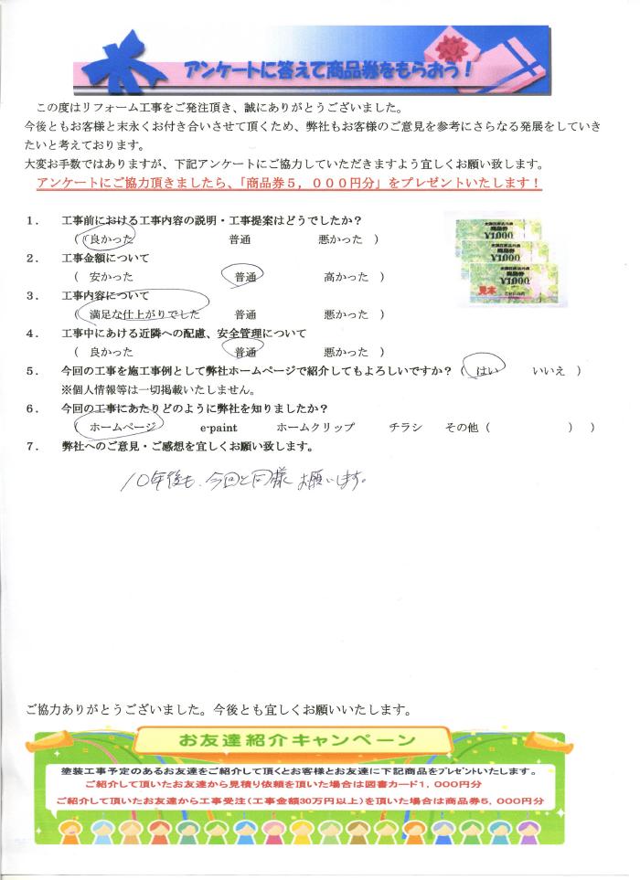 名古屋市北区で外壁塗装リフォームをされたお客様の声 1.工事前における工事内容の説明・工事提案はどうでしたか? 良かった 2.工事金額について 普通 3.工事内容について 満足な仕上がりでした 4.工事中にあける近隣への配慮、安全管理について 普通 5.弊社へのご感想・工事発注した理由等を宜しくお願い致します。 10年後も今回と同様お願いします 10年後も今回と同様お願いします 前の記事 次の記事 一覧へ戻る