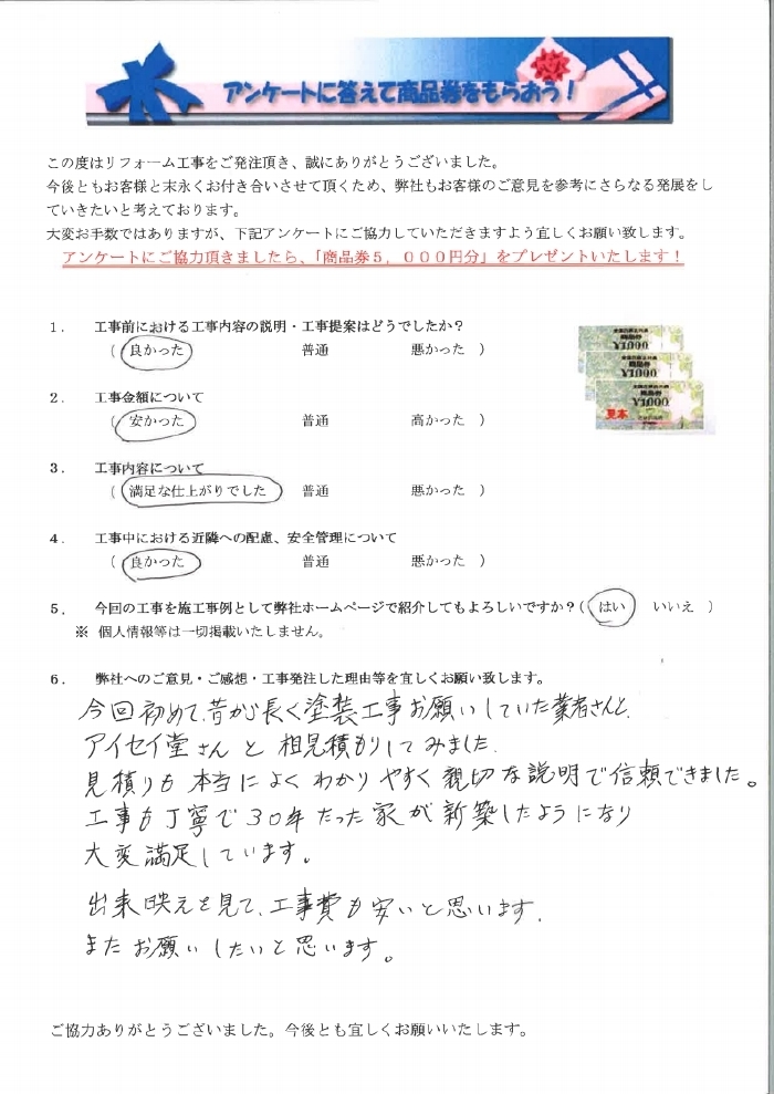 今回初めて昔から長く塗装工事お願いしていた業者さんとアイセイ堂さんと相見積もりしてみました。見積りも本当によくわかりやすく親切な説明で信頼できました。工事も丁寧で30年たった家が新築したようになり大変満足しています。出来栄えを見て、工事費も安いと思います。またお願いしたいと思います。