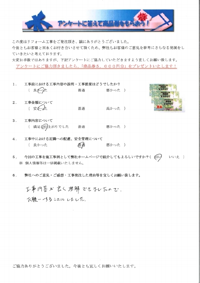 みよし市で外壁塗装リフォームをされたお客様の声 1.工事前における工事内容の説明・工事提案はどうでしたか? 良かった 2.工事金額について 安かった 3.工事内容について 満足な仕上がりでした 4.工事中にあける近隣への配慮、安全管理について 普通 5.弊社へのご感想・工事発注した理由等を宜しくお願い致します。 工事内容が良く理解できましたのお願いすることにしました。 工事内容が良く理解できましたのお願いすることにしました。 前の記事 次の記事 一覧へ戻る
