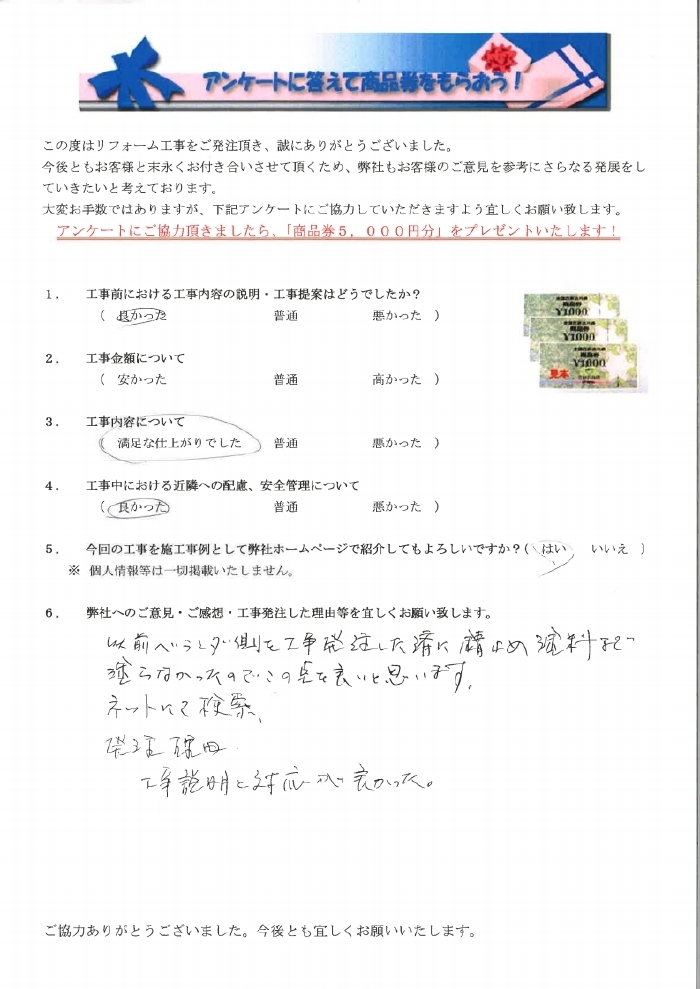 一宮市で外壁塗装リフォームをされたお客様の声 1.工事前における工事内容の説明・工事提案はどうでしたか? 良かった 2.工事金額について 安かった 3.工事内容について 満足な仕上がりでした 4.工事中にあける近隣への配慮、安全管理について 良かった 5.弊社へのご感想・工事発注した理由等を宜しくお願い致します。 以前ベランダ側を工事発注した際に錆止め塗料まで塗らなかったのでこの点は良いと思います。ネットにて検索。発注は工事説明と対応が良かった。 以前ベランダ側を工事発注した際に錆止め塗料まで塗らなかったのでこの点は良いと思います。ネットにて検索。発注は工事説明と対応が良かった。 前の記事 次の記事 一覧へ戻る