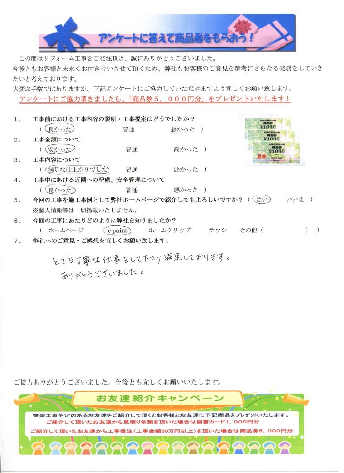 刈谷市で外壁塗装リフォームをされたお客様の声 1.工事前における工事内容の説明・工事提案はどうでしたか? 良かった 2.工事金額について 安かった 3.工事内容について 満足な仕上がりでした 4.工事中にあける近隣への配慮、安全管理について 良かった 5.弊社へのご感想・工事発注した理由等を宜しくお願い致します。 とても丁寧な仕事をして下さり満足しております。ありがとうございました。 とても丁寧な仕事をして下さり満足しております。ありがとうございました。 前の記事 次の記事 一覧へ戻る