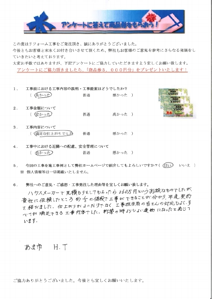 ハウスメーカーで見積りをしてもらったら360万円という高額なものでしたが貴社に依頼したところ約3分の1の値段で工事ができることが分かり早速契約を結びました。仕上がりがよいだけでなく、工事担当者の皆さんの対応もよく、すべてが満足できる工事内容でした。新築の時よりもよい建物になったと感じています。