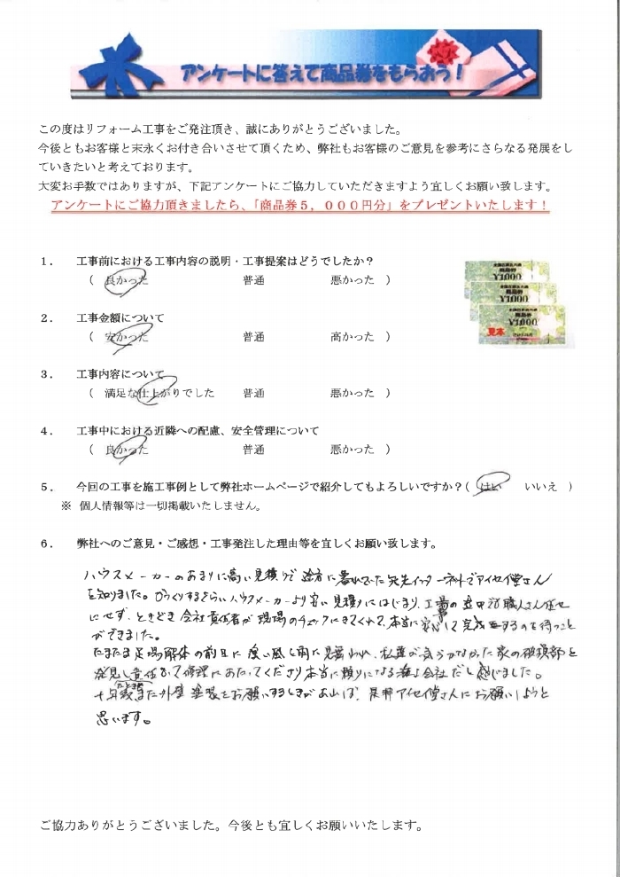 ハウスメーカーのあまりに高い見積りで途方に暮れていた矢先インターネットでアイセイ堂さんを知りました。びっくりするぐらいハウスメーカーより安い見積りにはじまり、工事の途中でも職人さん任せにせずときどき会社責任者が現場のチャックにきてくれて本当に安心して完成するのを待つことできました。たまたま足場解体の前日に強い風と雨に見舞われ私達が気が付かなかった家の破損部を発見したときも責任もって修理にあたってください本当に頼りになる施工会社だと感じました。十年後、また外壁塗装をお願いするときがあれば、ぜひアイセイ堂さんにお願いしようと思います。