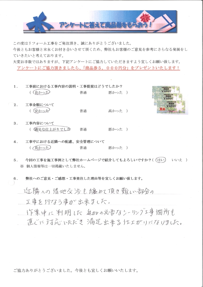 近隣への借地交渉も纏めて頂き、難しい部分の工事を行うことができました。作業中に判明した追加の必要なシーリング工事個所も直ぐに対応頂き満足出来る仕上がりになりました。