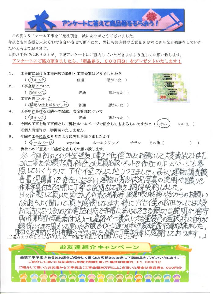 今回初めての外壁塗装工事をアイセイ堂さんにお願いして大変満足しています。この工事を依頼する前、他社との見積比較、ネットで他社のホームページを参照していくうちにアイセイ堂さんにたどりつきました。最初建物調査報告書で他社にはない建物の劣化状況写真の説明や見積も作業写真付きで非常に丁寧な説明をして頂き納得契約しました。日々作業をして頂いた皆さんも作業の始業時、終業時の挨拶や私からのお願いも気持ちよく聞いて頂き感謝しています。特にアイセイ堂の松田さんには大変お世話になり初めての電話対応で非常に安心できる親切な説明から留守中の作業内容(写真添付)をメール連絡や一番気になる塗装色の選択時に自分が納得いくまで協力して頂いたお陰でイメージ通りのわが家が完成する事が出来ました。「本当のお世話になり有難うございました。最後に丁寧な仕事に感謝しております。」