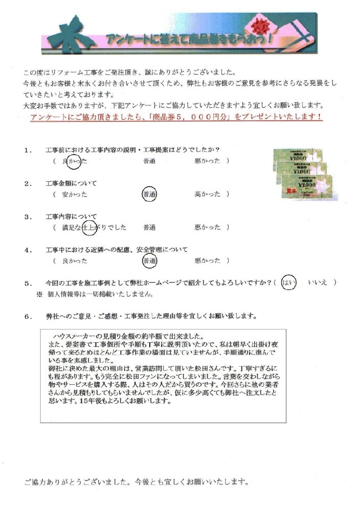 ハウスメーカーの見積り金額の約半額で出来ました。また、提案書で工事個所や手順も丁寧に説明頂いたので、私は朝早く出掛け夜帰って来る為、ほとんど工事作業の場面は見ていませんが、手順通りに進んでいる事を実感しました。御社に決めた最大の理由は営業訪問して頂いた営業マンです。丁寧すぎるにも程があります。もう完全に営業マンのファンになってしまいました。言葉を交わしながら物やサービスを購入する際、人はその人だから買うのです。今回さらに他の業者さんから見積りをしてもらいませんでしたが、仮に多少高くても御社へ注文したと思います。15年後もよろしくお願いします。