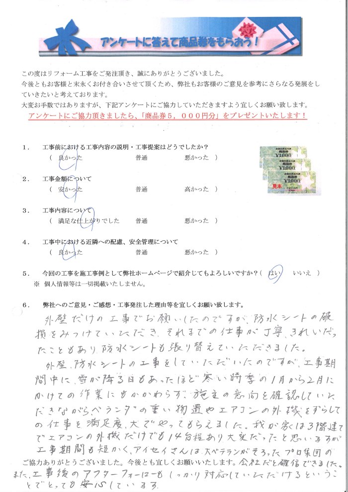 外壁だけの工事でお願いしたのですが、防水シートの破損を見つけて頂き、それまでの仕事が丁寧・綺麗だったこともあり、防水シートも張り替えて頂きました。外壁、防水シートの工事をして頂いたのですが、工事期間中に雪が降る日もあったほど寒い時季の1月から2月にかけての作業にも関わらず、施主の意向を確認して頂きながらベランダの重い物置やエアコンの室外機をずらしての仕事を満足度大でやってもらえました。我が家は3階建でエアコンの室外機だけでも14台程あり大変だったと思いますが工事期間も短くアイセイ堂さんは大ベテランがそろったプロ集団の会社だと確信できました。また、工事後のアフターフォローもしっかり対応して頂けるということでとっても安心しています。