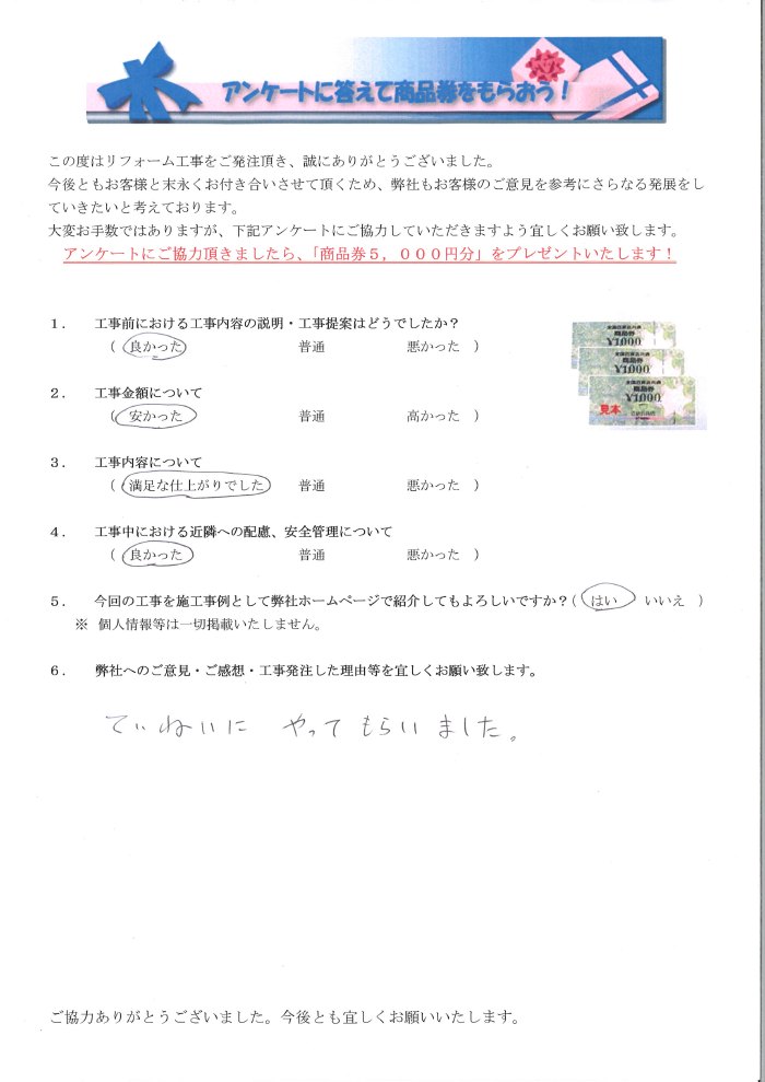 一宮市で外壁塗装リフォームをされたお客様の声 1.工事前における工事内容の説明・工事提案はどうでしたか? 良かった 2.工事金額について 安かった 3.工事内容について 満足な仕上がりでした 4.工事中にあける近隣への配慮安全管理について 良かった 5.弊社へのご感想・工事発注した理由等を宜しくお願い致します。 丁寧にやってもらいました。 丁寧にやってもらいました。 前の記事 次の記事 一覧へ戻る