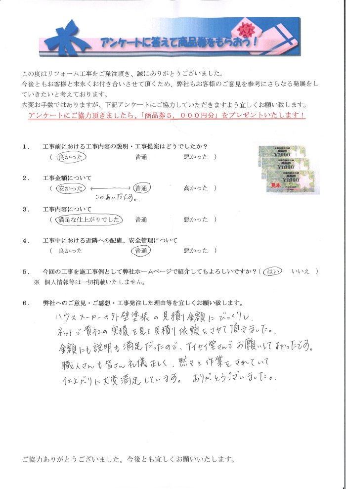 ハウスメーカーの外壁塗装の見積り金額にびっくりし、ネットで貴社の実績を見て見積り依頼をさせて頂きました。金額にも説明も満足だったので、アイセイ堂さんでお願いしてよかったです。職人さんも皆さん礼儀正しく、黙々と作業をされていて仕上がりに大変満足しています。ありがとうございました。