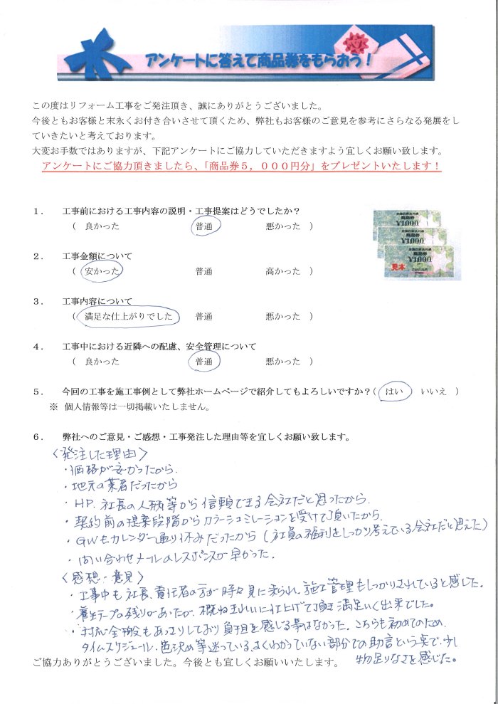 発注した理由:価格が安かったから。地元の業者だったから。HPや社長の人柄等から信頼できる会社だと思ったから。契約前の提案段階からカラーシュミレーションを受けて頂いたから。GWもカレンダー通り休みだったから(社員の福利をしっかり考えている会社だと思えた)。問い合わせメールレスポンスが早かった。