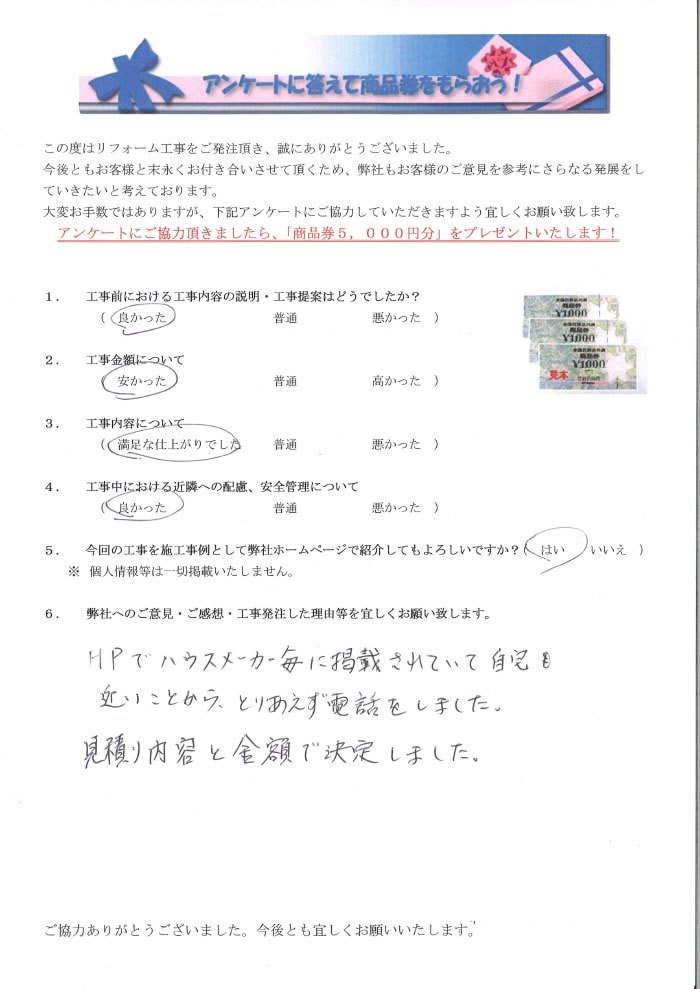 HPでハウスメーカー毎に掲載されていて自宅も近い事からとりあえず電話をしました。見積内容と金額で決定しました。外壁塗装ありがとうございました。前回の塗装で色選びで失敗をした為、今回は慎重に(迷って)色選びをしました。こんな私どもに丁寧にアドバイスをして頂きました。職人のMさんも仕事内容を毎回丁寧に説明され、安心して任せられました。大満足です。
