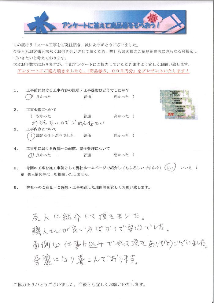 愛西市で外壁塗装リフォームをされたお客様の声 1.工事前における工事内容の説明・工事提案はどうでしたか? 良かった 2.工事金額について わからないです 3.工事内容について 満足な仕上がりでした 4.工事中にあける近隣への配慮安全管理について 良かった 5.弊社へのご感想・工事発注した理由等を宜しくお願い致します。 友人に紹介して頂きました。職人さんが良い方ばかりで安心でした。面倒な仕事も込みでやって頂きありがとうございました。綺麗になり喜んでおります。 友人に紹介して頂きました。職人さんが良い方ばかりで安心でした。面倒な仕事も込みでやって頂きありがとうございました。綺麗になり喜んでおります。 前の記事 次の記事 一覧へ戻る