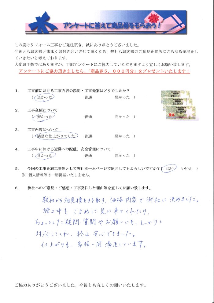 数社から相見積もりを取り、価格・内容で御社に決めました。施工中もこまめに見に来てくれたり、ちょっとした疑問・質問やお願いにもしっかりと対応してくれ、終始安心できました。仕上がりも家族一同満足しています。