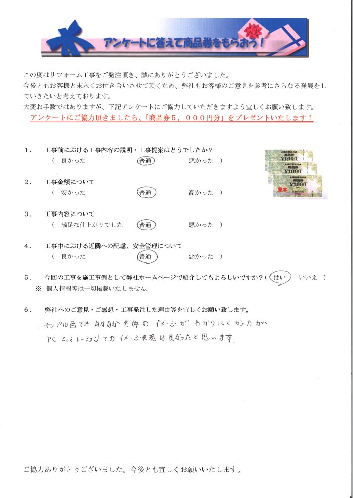 名古屋市港区でマンション外壁塗装リフォームをされたお客様の声 1.工事前における工事内容の説明・工事提案はどうでしたか? 普通 2.工事金額について 普通 3.工事内容について 普通 4.工事中にあける近隣への配慮安全管理について 普通 5.弊社へのご感想・工事発注した理由等を宜しくお願い致します。 サンプル色ではなかなか全体のイメージがわかりにくかったがPCシミュレーションでのイメージ表現は良かったと思います。 サンプル色ではなかなか全体のイメージがわかりにくかったがPCシミュレーションでのイメージ表現は良かったと思います。 ORDER このお客様の施工内容 名古屋市港区 マンション外壁塗装リフォーム 費用:800万円/工期:28日 前の記事 次の記事 一覧へ戻る