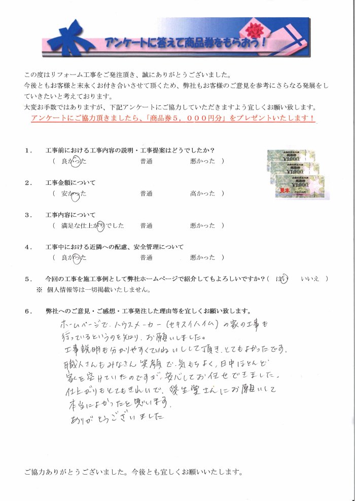 ホームページでハウスメーカー(セキスイハイム)の家の工事も行っているというのを知り、お願いしました。工事説明も分かりやすく、丁寧にして頂き、とてもよかったです。職人さんもみなさん笑顔で気持ちよく、日中ほとんど家を空けていたのですが、安心してお任せできました。仕上がりもとてもきれいでアイセイ堂さんにお願いして本当によかったとお思います。ありがとうございました。